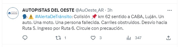 Pasadas las 6 de la mañana, se produjo un siniestro fatal en el Acceso Oeste, a la altura del kilómetro 62 en dirección a la Ciudad Autónoma de Buenos Aires. En la conexión de ingreso al Acceso Oeste desde la ruta 5. Los involucrados fueron un automóvil y una motocicleta, resultando en la trágica pérdida de la vida de un hombre, y una mujer herida.