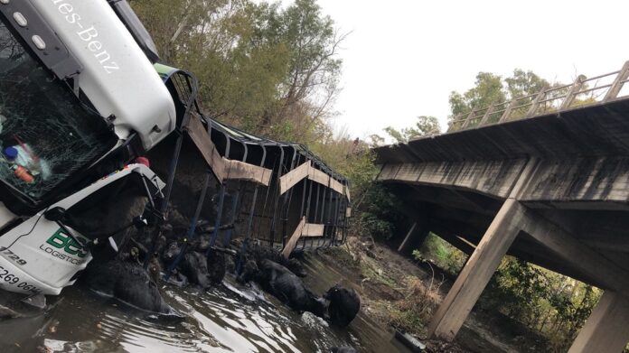 La ruta no fue cortada al tránsito, aunque se registraron demoras. El camión transportaba 59 terneros, todos muertos por el impacto.