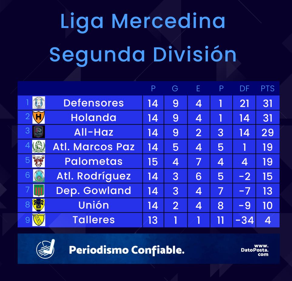 Durante el domingo se disputó la fecha 16 de la Segunda División de la Liga Mercedina de Fútbol que dejó resultados interesantes, sobre todo porque al certamen le quedan sólo dos jornadas por disputar para conocer qué equipos ascienden a la primera categoría. Entre Holanda, Defensores y All-Haz se define todo.