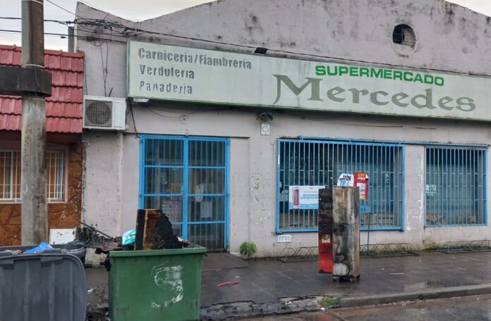 En la puerta del local se puede observar los contenedores con elementos que fueron tirados tras sufrir las llamas y una heladera que se encontraba normalmente en el ingreso del supermercado.