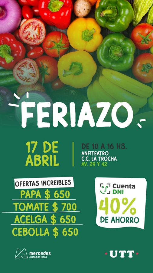 A modo de ejmplo, habrá papa a $650 el kg, tomates a $ 700, acelga a 650, y el kg de cebolla a $650. Y a estos precios, pagando con Cuenta DNI, se obtiene un 40 % de descuento en la compra.