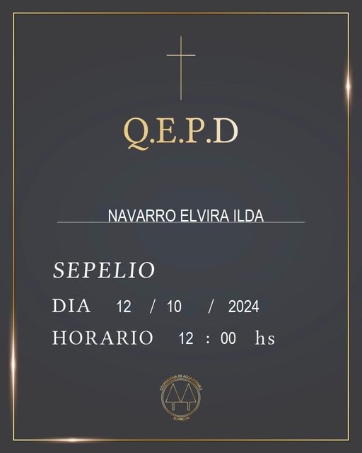 InicioSociedadObituarios Obituarios ILDA ELVIRA NAVARRO Q.E.P.D. By datoposta 11 octubre, 2024 0 938 FacebookTwitterPinterestWhatsApp Falleció el día viernes 11 de octubre de 2024 Sepelio: sábado 12, a las 12 horas 90 años🔎 Te puede interesarPEDRO MODESTO RICCI CABUCCIO (TITO) Q.E.P.D.noviembre 2024IRMA BEATRIZ LIDIA ANTINORI Q.E.P.D.mayo 2025NELIDA ELSA MARQUEZ DE MAGALLAN Q.E.P.D.febrero 2025 Suipacha Comparte esto: Haz clic para compartir en Facebook (Se abre en una ventana nueva) Facebook Haz clic para compartir en X (Se abre en una ventana nueva) X Me gusta esto:Me gusta Cargando... TagsILDA ELVIRA NAVARRO Q.E.P.D. Cuota FacebookTwitterPinterestWhatsApp Artículo anteriorSANACIÓN Y METAFÍSICA: NIÑOS ÍNDIGOArtículo siguienteLIGA MERCEDINA: DESCENDIÓ PABELLÓN DE MARCOS PAZ datoposta Articulos relacionados Sociedad EL PROGRAMA RECREO SIGUE BRINDANDO UN ESPACIO IMPORTANTE A LA NIÑEZ DE MERCEDES Curiosidades CURIOSIDADES DEL 16 DE JULIO: DIA DEL SERVICIO PENITENCIARIO FEDERAL Obituarios MARTHA LILIA ZANETTI VIUDA DE RAPONI Q.E.P.D. Mas leidas Sociedad VIRALIZAN TIERNA IMÁGEN DE ABUELOS MERCEDINOS Y EXPLOTAN LAS REDES SOCIALES Obituarios CIPRIANO ROGELIO VEGA Q.E.P.D. Obituarios JUANA DELIA DÍAZ Q.E.P.D. DEJA UNA RESPUESTA Cancelar respuesta Comentario: Por favor ingrese su comentario! Nombre:* Por favor ingrese su nombre aquí Correo electrónico:* ¡Has introducido una dirección de correo electrónico incorrecta! Por favor ingrese su dirección de correo electrónico aquí Sitio web: Guardar mi nombre, correo electrónico y sitio web en este navegador la próxima vez que comente. Δ Seguinos4,568FansMe gusta985SeguidoresSeguir512SeguidoresSeguir Ultimos articulos Política SÁBADO CON UNA MARCHA Y FIESTA DEL ORGULLO Obituarios SERGIO FRANCISCO MARTINO Q.E.P.D. Curiosidades CURIOSIDADES DEL 24 DE NOVIEMBRE: DIA MUNDIAL DEL VINO TINTO Obituarios MIGUEL ANGEL DOÑAGUEDA Q.E.P.D. Obituarios ROBERTO FRANCISCO CASARETTO Q.E.P.D. Cargar más