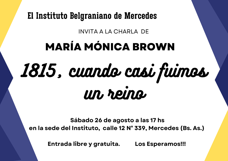 Bajo el título de “1815, cuando casi fuimos un reino” la profesora se referirá a la misión diplomática de Belgrano y Rivadavia en Londres, y al proyecto de creación de un reino independiente con capital en Buenos Aires, cuyo rey sería el hermano menor de Fernando VII.
