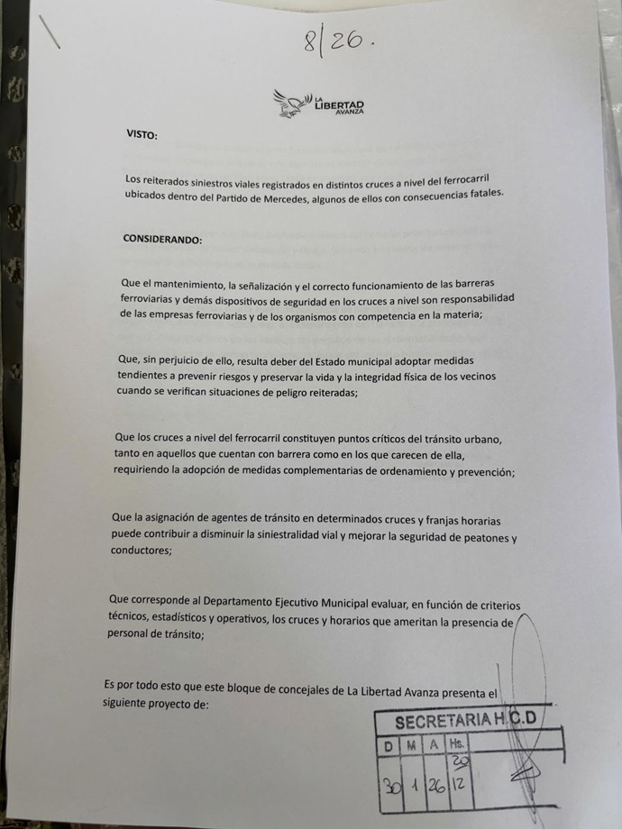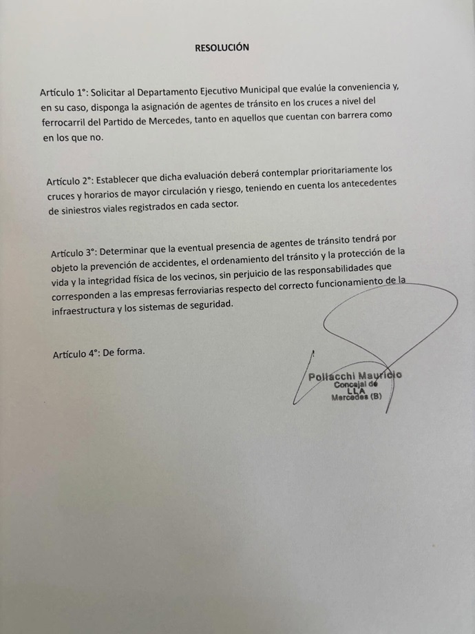 El concejal de La Libertad Avanza Mauricio Pollacchi, realizó un Proyecto de Resolución, que se presentó en el Legislativo local para la designación de agentes de Tránsito en algunos cruces ferroviarios de la ciudad.