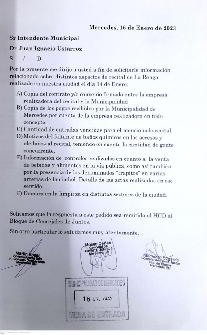 El Bloque de Juntos, a través de su concejal Carlos Mosso, realizó una presentación en el HCD un pedido de informes al Departamento Ejecutivo sobre diferentes puntos relacionados a la llegada de La Renga a Mercedes