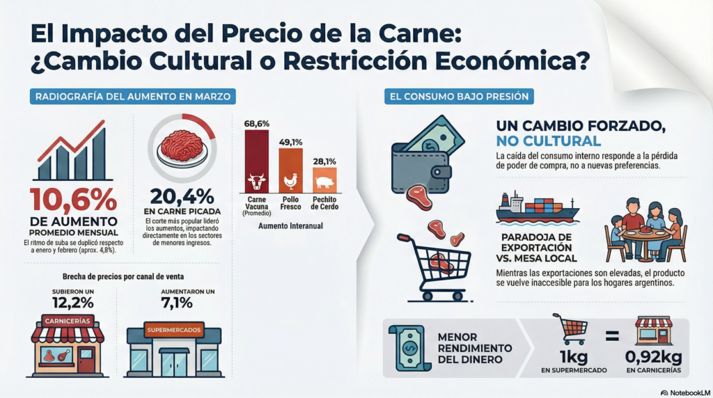 Recientemente, voces del sector agropecuario —como Nicolás Pino— sugirieron que la baja en el consumo responde a un «cambio cultural» de los argentinos. Sin embargo, los datos cuentan otra historia.
