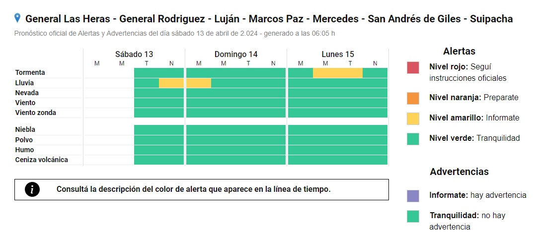 Para Mercedes, San Andrés de Giles, Suipacha y resto de la región, el alerta comienza por la noche de hoy sábado y madrugada del domingo. Y termina durante la mañana y tarde del lunes.