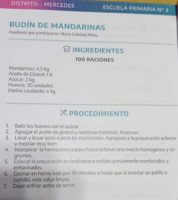 La cocinera Soledad Alday, auxiliar de la Escuela Primaria N° 3 de Mercedes, fue la elegida para representar a nuestra localidad. Su deliciosa y nutritiva receta de «Budín de Mandarina» fue seleccionada por la Dirección de Nutrición y Calidad de los Alimentos para formar parte de esta importante publicación provincial.
