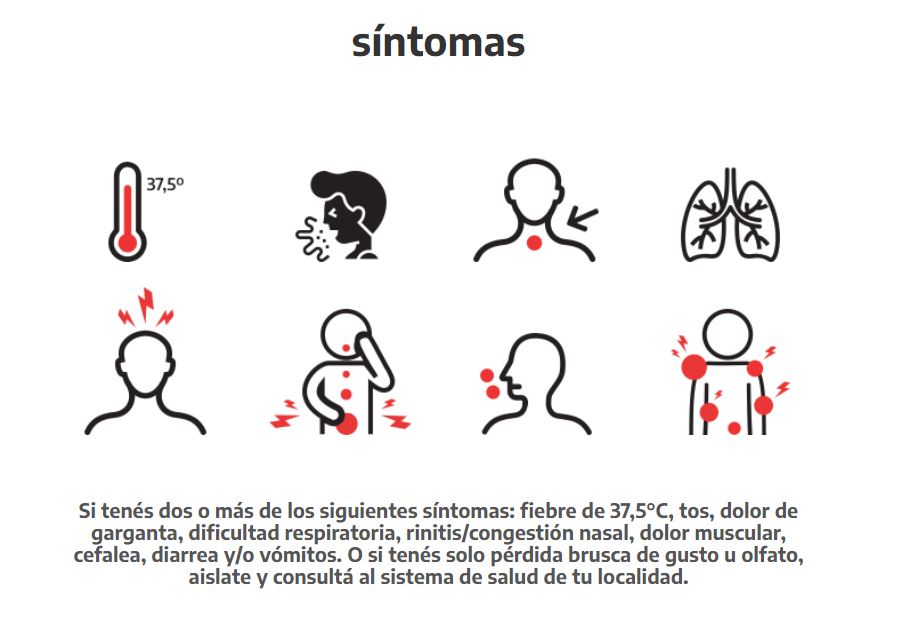 De esta manera, cualquier persona que presente fiebre mayor a 37,5 grados, tos, dolor de garganta, dificultad respiratoria, rinitis/congestión nasal, dolor muscular, cefalea, diarrea y/o vómitos, o bien solo pérdida brusca de gusto u olfato, debe aislarse, avisar a las personas con las que estuvo en los últimos días y consultar al sistema de salud.