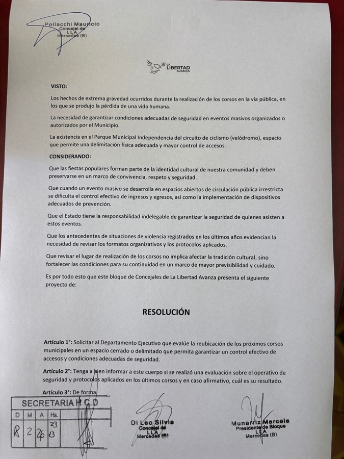 Tras la reciente suspensión de los Carnavales locales debido al trágico fallecimiento del joven Brian Cabrera (18), y el pedido del intendente de esperar para repensar junto a la comunidad sobre el futuro de los Carnavales, el bloque de concejales de La Libertad Avanza presentó este miércoles un proyecto de Resolución en el Concejo Deliberante para modificar los tradicionales festejos.