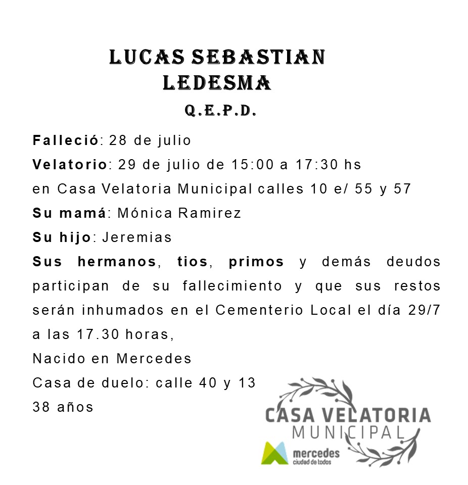 Sepelio: martes 29, a las 17.30, previo responso en Casa Velatoria Municipal.