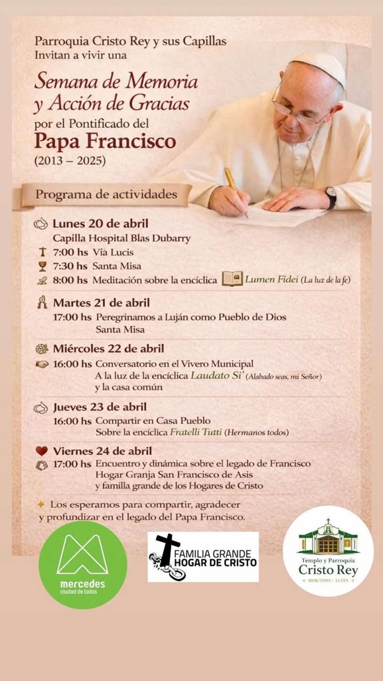 En Mercedes también se sumará al recuerdo del Sumo Pontífice. La Capilla Cristo Rey ha lanzado una invitación a la comunidad para participar de la «Semana de Memoria y Acción de Gracias».