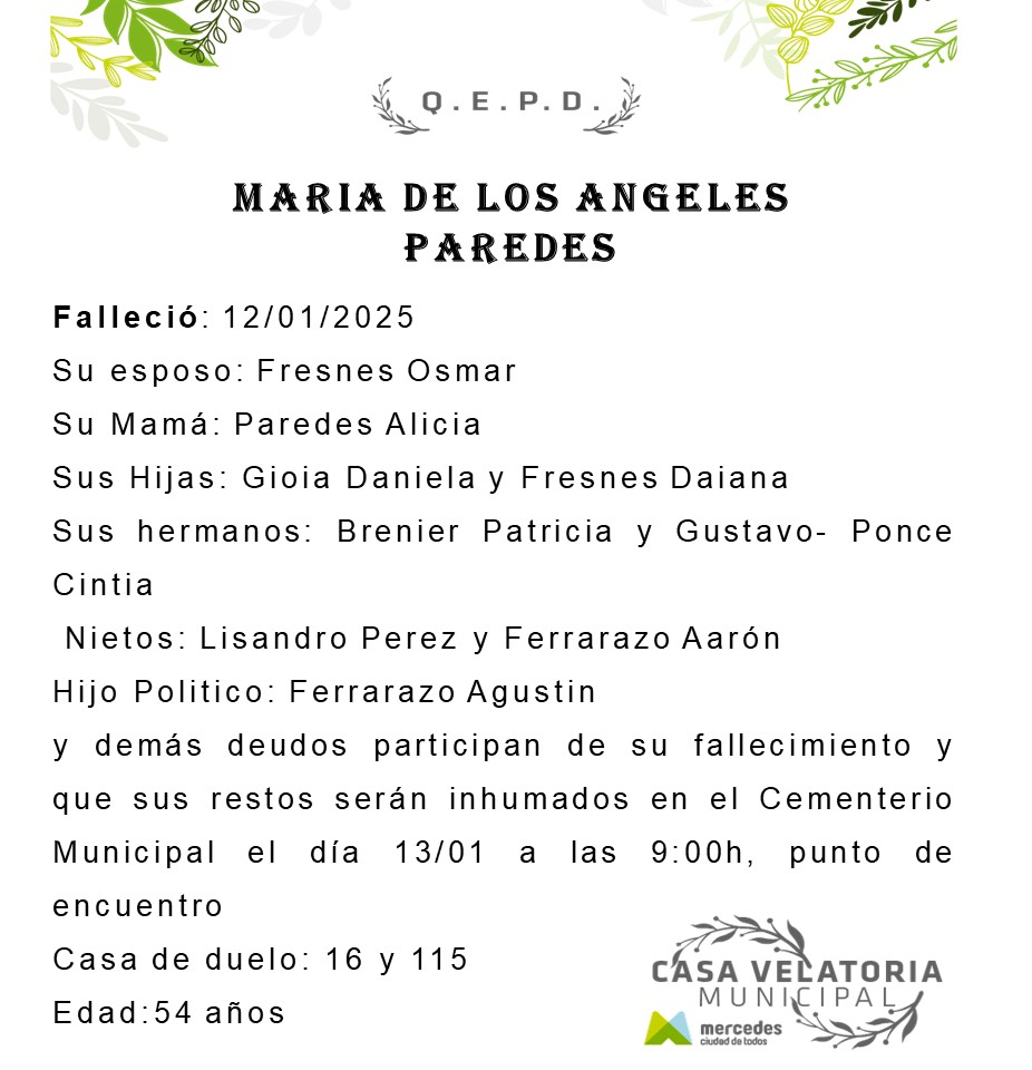InicioSociedadObituarios Obituarios MARIA DE LOS ANGELES PAREDES Q.E.P.D. By datoposta 12 enero, 2025 0 1869 FacebookTwitterPinterestWhatsApp A close up of an orange candle and flame and lily flowers on a dark background. Falleció el día 12 de enero de 2025 Sepelio: Lunes 13, a las 9 horas -punto de encuentro- Casa de duelo: 16 y 115 54 años Comparte esto: Haz clic para compartir en Facebook (Se abre en una ventana nueva) Facebook Haz clic para compartir en X (Se abre en una ventana nueva) X Me gusta esto:Me gusta Cargando... TagsMARIA DE LOS ANGELES PAREDES Q.E.P.D. Cuota FacebookTwitterPinterestWhatsApp Artículo anteriorFLANDRIA ENFRENTÓ A OLIMPIA EN AMISTOSO Y BENEDETTO HIZO UN GOLArtículo siguienteRÍO ARECO: UN JOVEN FUE A PESCAR CON AMIGOS Y SE AHOGÓ datoposta Articulos relacionados Suipacha CONMOCIÓN EN SUIPACHA: DENUNCIAN A EX INTENDENTE POR VENTA IRREGULAR DE TIERRAS Sociedad INAUGURAN EL HOSPITAL ODONTOLÓGICO UNIVERSITARIO MUNICIPAL Sociedad SE PRESENTÓ EL MAPEO DE ESCUELAS FUMIGADAS DE MERCEDES Mas leidas Policiales GRAVE SINIESTRO EN EL INGRESO A MERCEDES POR RUTA 5 Policiales FUERTE CHOQUE ENTRE AUTOMÓVILES EN 10 Y 45 Policiales INCENDIO Y DESTRUCCIÓN TOTAL DE AUTOMÓVIL EN RUTA 5 DE MERCEDES DEJA UNA RESPUESTA Cancelar respuesta Comentario: Por favor ingrese su comentario! Nombre:* Por favor ingrese su nombre aquí Correo electrónico:* ¡Has introducido una dirección de correo electrónico incorrecta! Por favor ingrese su dirección de correo electrónico aquí Sitio web: Guardar mi nombre, correo electrónico y sitio web en este navegador la próxima vez que comente. Δ Seguinos4,568FansMe gusta985SeguidoresSeguir512SeguidoresSeguir Ultimos articulos Curiosidades CURIOSIDADES DEL 6 DE OCTUBRE: DIA DEL CIRCO ARGENTINO Nacionales ESCÁNDALO: ESPERT RENUNCIÓ A SU CANDIDATURA A DIPUTADO Policiales GRAVE SINIESTRO EN EL INGRESO A MERCEDES POR RUTA 5 Columnistas SANACIÓN Y METAFÍSICA: EL SER DIVINO Policiales FUERTE CHOQUE ENTRE AUTOMÓVILES EN 10 Y 45 Cargar más