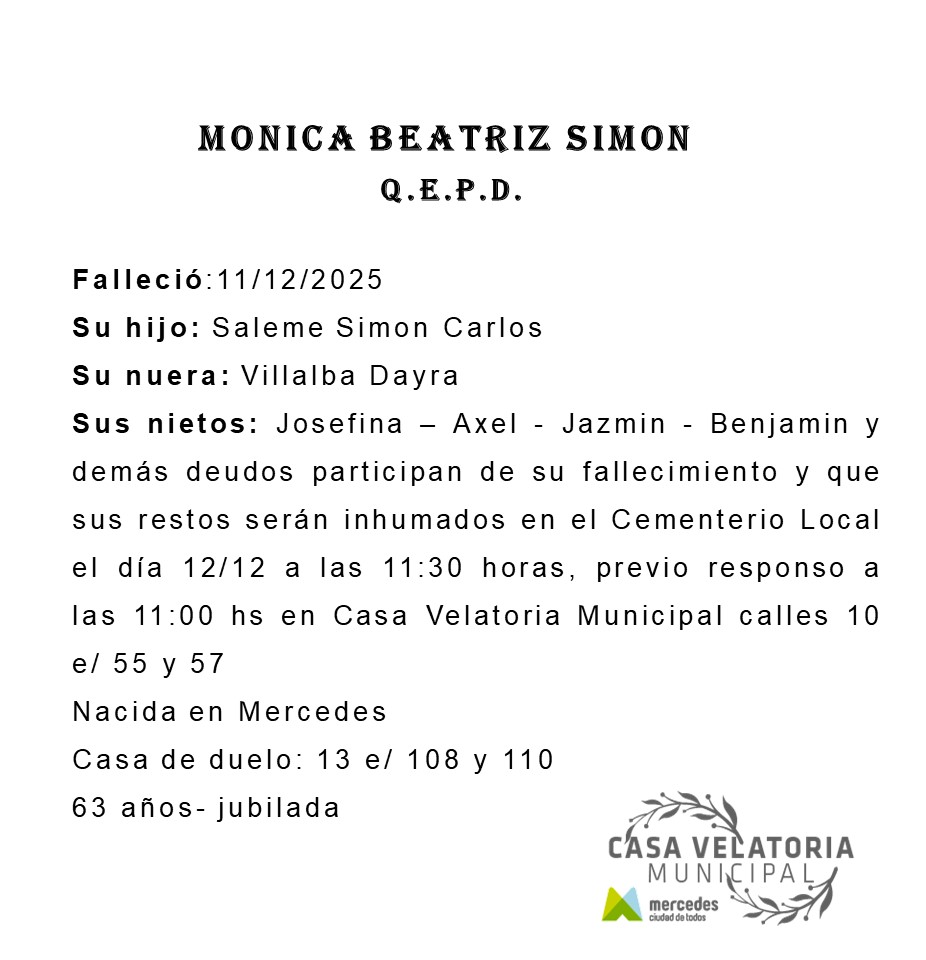 Sepelio: viernes 12, a las 11.30, previo Responso a las 11 horas en la Casa Velatoria Municipal de calle 10 entre 55 y 57