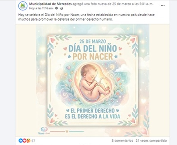 La imagen habla por sí sola. La municipalidad de Mercedes ha publicado en sus redes oficiales una salutación en el marco del “Día del niño por nacer” establecido durante el menemismo un día después del 24 de Marzo, fecha en la que 50 años después seguimos exigiendo la apertura de archivos y restitución de bebés apropiados.