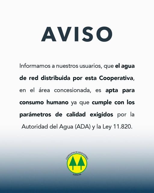 En Suipacha, que se encuentra en la misma situación de Mercedes con respecto a las mediciones dadas a conocer públicamente, quién brinda el agua es la Cooperativa de Agua Potable. Un servicio privado. Allí, la Cooperativa emitió el siguiente comunicado.