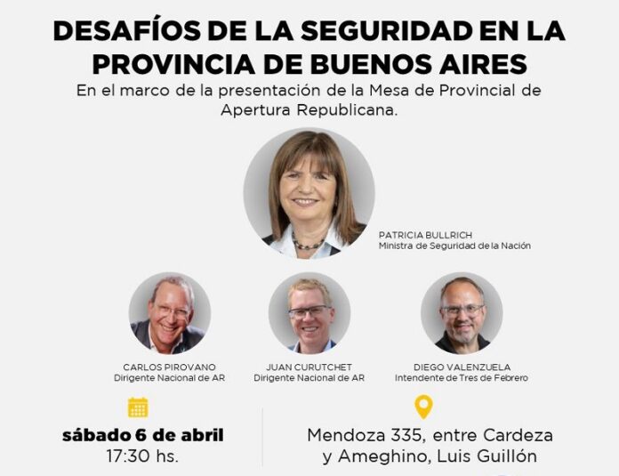 Estarán presentes la MINISTRO DE SEGURIDAD, Patricia Bullrich, referente principal de Apertura Republicana, Diego Valenzuela, Intendente de 3 de febrero, y otros dirigentes de esta nueva línea política como Juan Curutchet y Carlos Pirovano entre otros.