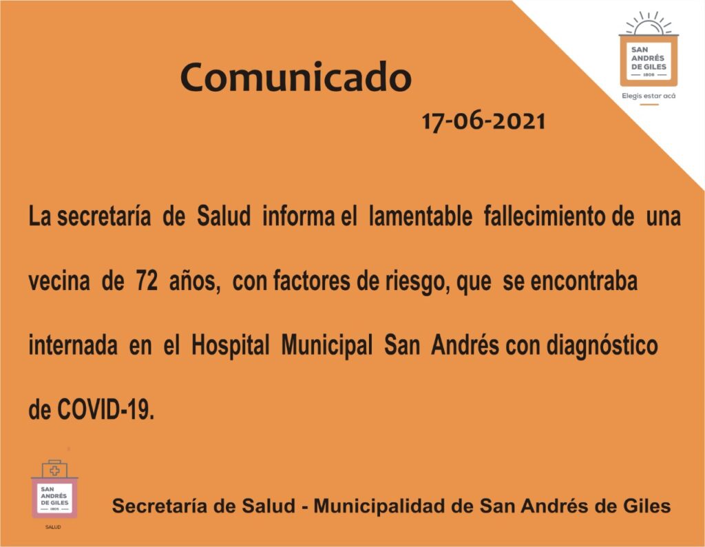 Se confirmó un fallecimiento más de una vecina de 72 años con factores de riesgo que se encontraba internada en el Hospital San Andrés. Mientras tanto el numero de contagios diarios en San Andrés de Giles sigue siendo alto. Hoy se confirman 23 nuevos positivos y Giles tiene 243 casos activos.