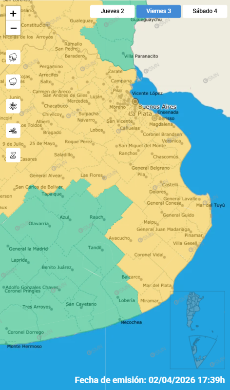 A nivel bonaerense, la situación es similar. Tras un jueves marcado por bancos de niebla, el viernes el frente frío avanzará desde el sudoeste hacia el noreste, afectando principalmente el centro y norte de la provincia con tormentas.