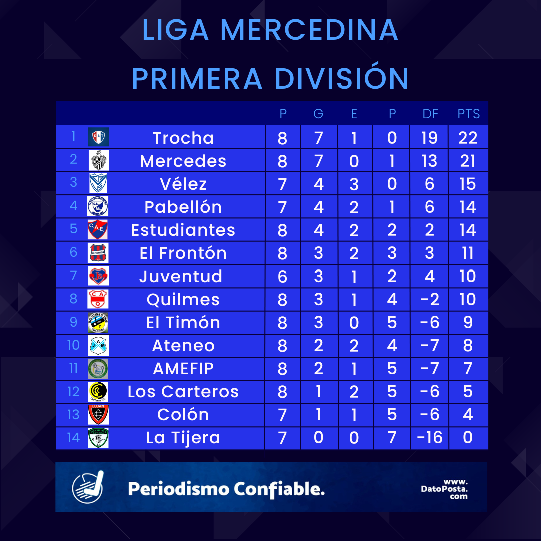 El sábado, domingo y lunes se jugó la octava fecha del certamen mayor de la Liga Mercedina de Fútbol. Al igual que las últimas fechas, Trocha y Club Mercedes siguen marcando el pulso del torneo y se mantienen en lo más alto. De cerca lo siguen Vélez (con un partido menos), Pabellón y Estudiantes que no pierden terreno. Al certamen le quedan cinco fechas para conocer los cruces de play-off.