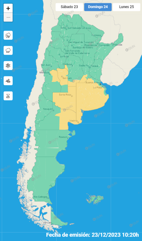 El Servicio Meteorológico Nacional (SMN) emitió este viernes un alerta de nivel amarillo por tormentas para la tarde y la noche del domingo 24 de diciembre. La zonas bajo alerta son el sur y centro de la provincia de Buenos Aires, centro y este de La Pampa, este de Río Negro, sur de Santa Fe y sur de Córdoba.