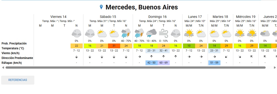 En la madrugada del domingo, Mercedes estará bajo tormentas de variada intensidad, con posibilidades de tormentas fuertes. Se espera abundante caída de agua en cortos períodos, actividad eléctrica, ráfagas de viento de hasta 70 kilómetros por hora y ocasional caída de granizo. La precipitación esperada es de 30 milímetros.