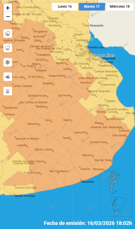 Para el resto de la provincia, el SMN mantiene el alerta naranja, especialmente en el norte de La Pampa, sur de Santa Fe y Córdoba. En estas áreas se esperan: