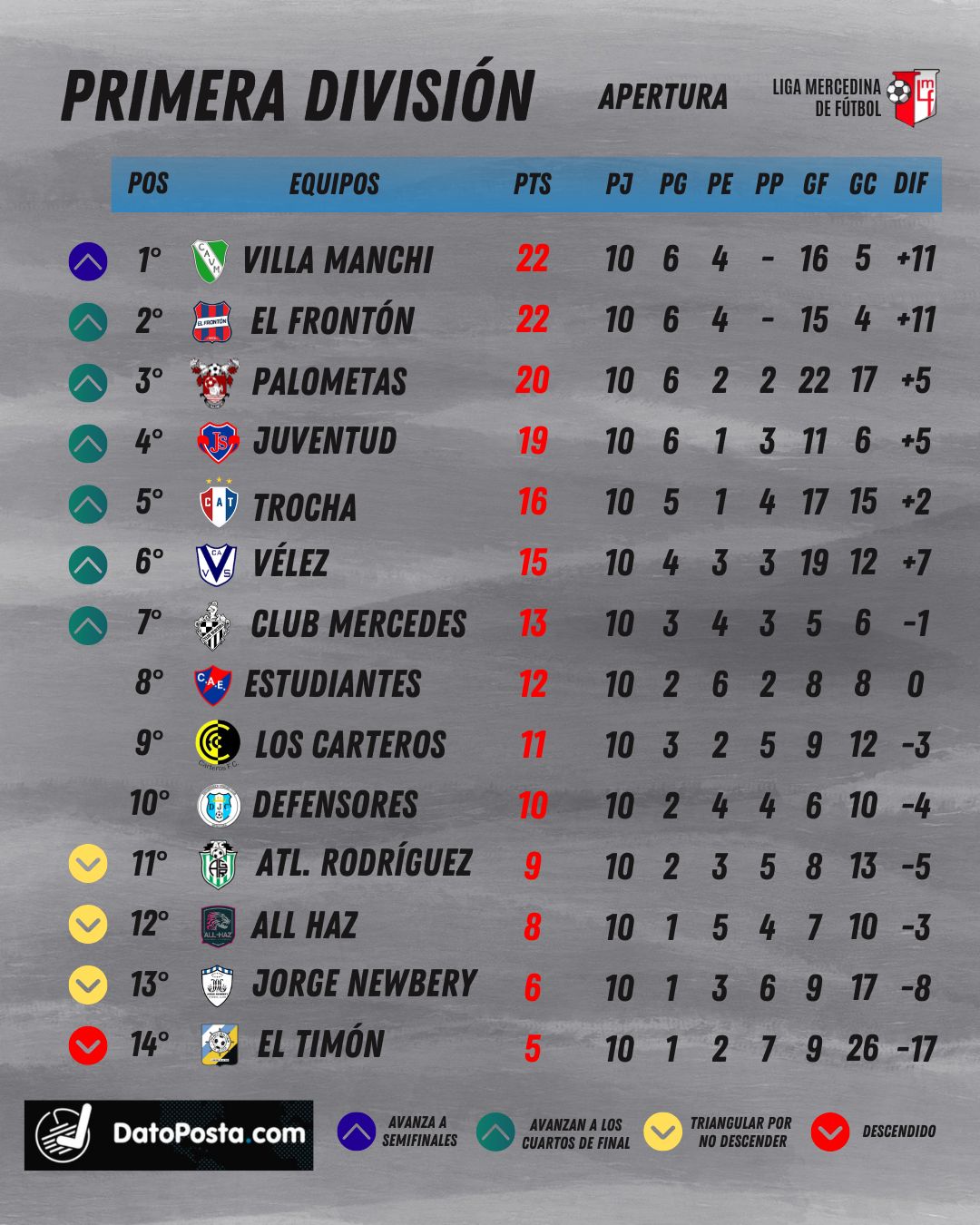 La décima fecha continuaba, pero previamente Estudiantes y El Frontón igualaron sin goles, Club Mercedes venció 1 a 0 a Carteros y Atlético General Rodríguez ante All Haz igualó 1 a 1 tras la decisión del Tribunal de Penas de dar por finalizado el partido luego de una serie de incidentes.