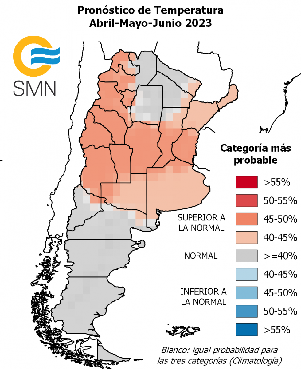 Durante este trimestre hay una mayor probabilidad de que se registren temperaturas por encima del promedio en el NOA (Noroeste Argentino), Cuyo, sur del Litoral y la provincia de Córdoba. Además, en La Pampa, Buenos Aires y el norte del Litoral las temperaturas pueden ser normales o superiores a lo normales para la época del año.