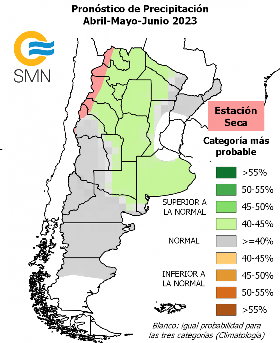 En cuanto a las lluvias, en el periodo abril-mayo-junio 2023 pueden ser normales o superiores a lo normales en las provincias del norte argentino, Córdoba, el oeste de Santa Fe, norte y este de San Luis, La Pampa y gran parte de Buenos Aires.