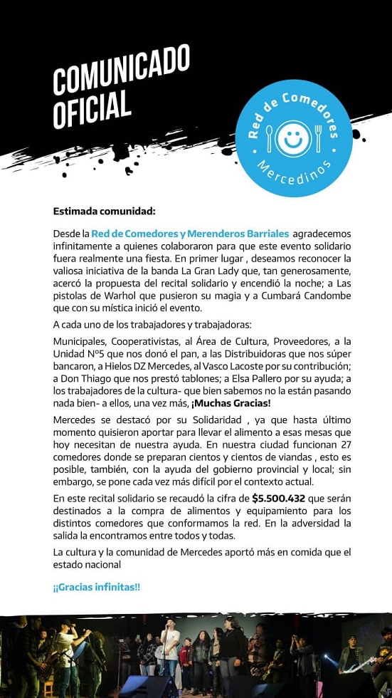 Desde la Red de Comedores mercedinos, hicieron llegar un comunicado oficial agradeciendo a todos los que participaron de una manera u otra para la realización de la movida solidaria que recaudó más de 5 millones de pesos y servirá para la compra de alimentos y equipamiento para las tareas diarias.