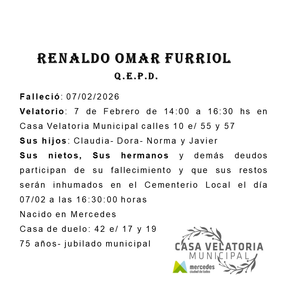 Sepelio: sábado 7, a las 16.30 horas, previo Responso en Casa Velatoria Municipal