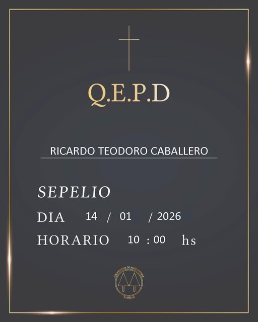 InicioSociedadObituarios Obituarios RICARDO TEODORO CABALLERO Q.E.P.D. By datoposta 13 enero, 2026 0 338 FacebookTwitterPinterestWhatsApp Falleció el día 13 de enero de 2026 Sepelio: miércoles 14, a las 10 horas Suipacha Comparte esto: Haz clic para compartir en Facebook (Se abre en una ventana nueva) Facebook Haz clic para compartir en X (Se abre en una ventana nueva) X Me gusta esto:Me gusta Cargando... TagsRICARDO TEODORO CABALLERO Q.E.P.D. Cuota FacebookTwitterPinterestWhatsApp Artículo anteriorGABRIELA JUANA MARCHESINI VDA de CUSA (TITI) Q.E.P.D.Artículo siguienteINFLACIÓN: EL INDICE MÁS BAJO EN OCHO AÑOS Y NO SE LOGRA PERFORAR PISO DE 2.5% datoposta Articulos relacionados Sociedad VACACIONES DE INVIERNO: PROPUESTA DEL VIVERO BIOTECNOLÓGICO MUNICIPAL PARA LA FAMILIA Nacionales SABRINA SELVA SE MOSTRÓ ARREPENTIDA DE SU GESTO A MILEI Nacionales UNA FAMILIA NECESITÓ 828 MIL PESOS PARA NO SER POBRE Mas leidas Sociedad MERCEDES LO LOGRÓ: SE JUNTÓ EL DINERO Y CHLOE PODRÁ SER OPERADA Nacionales ALERTA EN PROVINCIA: MUERE NIÑA CON HANTAVIRUS Y ES EL CUARTO CASO EN POCOS DIAS Policiales EFICAZ OPERATIVO EN MERCEDES: DETIENEN A 5 DELINCUENTES CON FRONDOSOS ANTECEDENTES DEJA UNA RESPUESTA Cancelar respuesta Comentario: Por favor ingrese su comentario! Nombre:* Por favor ingrese su nombre aquí Correo electrónico:* ¡Has introducido una dirección de correo electrónico incorrecta! Por favor ingrese su dirección de correo electrónico aquí Sitio web: Guardar mi nombre, correo electrónico y sitio web en este navegador la próxima vez que comente. Δ Seguinos4,568FansMe gusta985SeguidoresSeguir512SeguidoresSeguir Ultimos articulos Nacionales INFLACIÓN: EL INDICE MÁS BAJO EN OCHO AÑOS Y NO SE LOGRA PERFORAR PISO DE 2.5% Obituarios GABRIELA JUANA MARCHESINI VDA de CUSA (TITI) Q.E.P.D. Obituarios ROBERTO ALCIDES TASSARA Q.E.P.D. Curiosidades CURIOSIDADES DEL 13 DE ENERO: DIA DE LA LUCHA CONTRA LA DEPRESION Sociedad MERCEDES LO LOGRÓ: SE JUNTÓ EL DINERO Y CHLOE PODRÁ SER OPERADA Cargar más