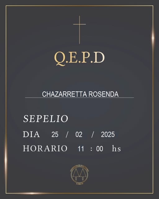 InicioSociedadObituarios Obituarios ROSENDA CHAZARETTA Q.E.P.D. By datoposta 24 febrero, 2025 0 992 FacebookTwitterPinterestWhatsApp Falleció el día 24 de febrero de 2024 Sepelio: martes 25, a las 11 horas 92 años🔎 Te puede interesarDEMIRTA YOLANDA MEDINA (HERMANA MIRTA) Q.E.P.D.diciembre 2024MARIA ESTHER GRISOLÍA Q.E.P.D.marzo 2025CARLOS ALBERTO CRISTOFARI Q.E.P.D.noviembre 2024 Suipacha Comparte esto: Haz clic para compartir en Facebook (Se abre en una ventana nueva) Facebook Haz clic para compartir en X (Se abre en una ventana nueva) X Me gusta esto:Me gusta Cargando... TagsROSENDA CHAZARETTA Q.E.P.D. Cuota FacebookTwitterPinterestWhatsApp Artículo anteriorSE VIENE EL 160° ANIVERSARIO DE LA LLEGADA DEL FF.CC DEL OESTE A MERCEDESArtículo siguienteALERTA AMARILLO POR TORMENTAS PARA MARTES Y MIÉRCOLES: EL RÍO SALIÓ DE SU CAUCE datoposta Articulos relacionados Obituarios PRIMITIVA ESTHER MORUA CORONEL Q.E.P.D. Política SILVIA DI LEO: «ME ECHÓ LA MAFIA DE LA LIBERTAD AVANZA» Policiales Trasladan al menor atropellado por el 57 Mas leidas Policiales RUTA 5: MURIÓ CONDUCTOR DE CAMIÓN LUEGO DE TRÁGICO VUELCO Nacionales TRAGEDIA EN PERGAMINO: EXPLOSIÓN EN FERIA ESCOLAR CON MENOR GRAVE Y HERIDOS Sociedad MAL TIEMPO: REPROGRAMAN LA EXPO FIESTA QUE SE IBA A REALIZAR ESTE DOMINGO DEJA UNA RESPUESTA Cancelar respuesta Comentario: Por favor ingrese su comentario! Nombre:* Por favor ingrese su nombre aquí Correo electrónico:* ¡Has introducido una dirección de correo electrónico incorrecta! Por favor ingrese su dirección de correo electrónico aquí Sitio web: Guardar mi nombre, correo electrónico y sitio web en este navegador la próxima vez que comente. Δ Seguinos4,568FansMe gusta985SeguidoresSeguir512SeguidoresSeguir Ultimos articulos Nacionales MILEI ANUNCIÓ UNA REFORMA LABORAL Y TRIBUTARIA Política LLA: PROYECTOS DE COMPETENCIA DE ALUMNOS EN MERCEDES ROCK Y DD.JJ A PLANTA POLÍTICA Sociedad MAL TIEMPO: REPROGRAMAN LA EXPO FIESTA QUE SE IBA A REALIZAR ESTE DOMINGO Nacionales ESCOBAR, VIDEO: RESCATISTA HERIDO EN SALVATAJE A DOS ANCIANOS BAJO UN CAMIÓN Nacionales LA PROVINCIA LANZA LA CAMPAÑA «VARONES QUE SE CUIDAN» Cargar más