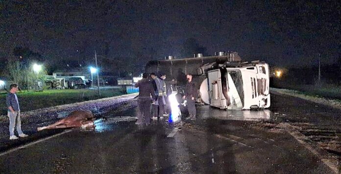Un caballo suelto en la ruta 5 produjo el vuelco de un camión cisterna que transportaba leche. El accidente ocurrió cerca de las 2 de la madrugada de este sábado 10 de julio, a la altura del km 160 entre las localidades de Chivilcoy y Alberti.