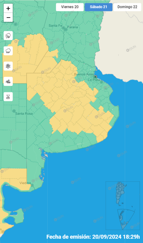 El Servicio Meteorológico Nacional (SMN) emitió una alerta de nivel “amarillo” para unos 29 distritos de la provincia de Buenos Aries que este sábado, en el Día de la Primavera, se verán afectados por fuertes tormentas.