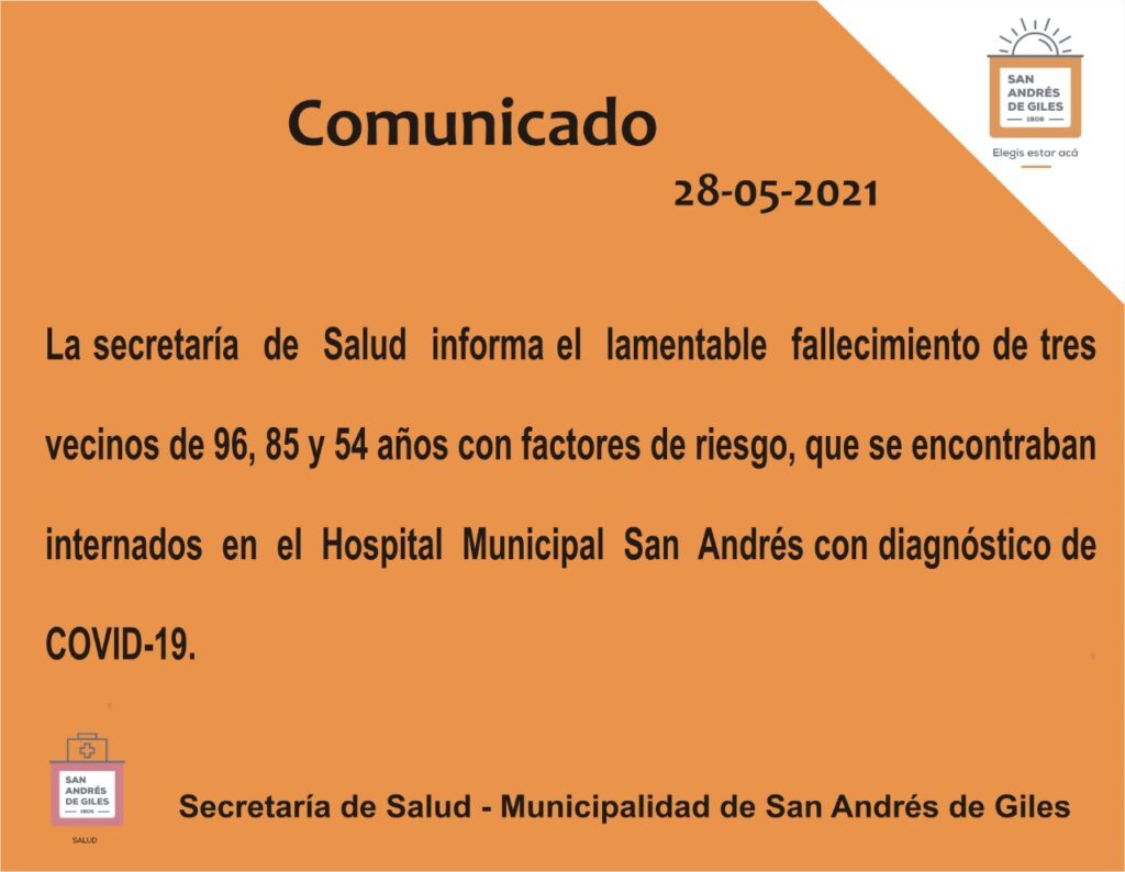 Este viernes por la mañana la Municipalidad de San Andrés de Giles informó a través de un comunicado el fallecimiento de tres vecinos. Se trata de pacientes con factores de riesgo que estaban internados en el Hospital San Andrés. Tenían 96, 85 y 54 años.