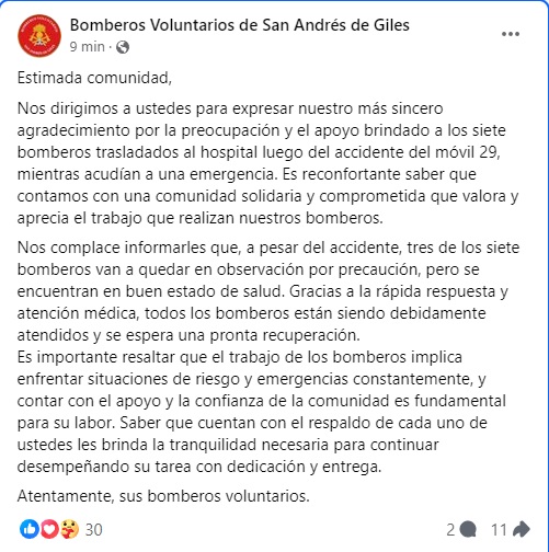 Una dotación del Cuerpo de Bomberos Voluntarios de San Andrés de Giles que se trasladaba a un servicio, volcó en el autobomba 29 y varios de los integrantes continúan internados.