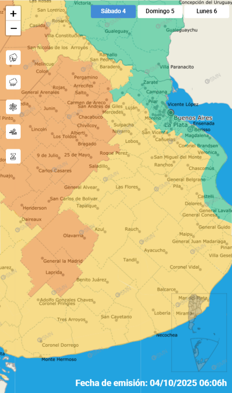 El Ministerio de Seguridad de la provincia de Buenos Aires advirtió que durante la madrugada del domingo avanzará un frente frío desde el oeste y sudoeste provincial, generando tormentas y lluvias de variada intensidad, con fuertes acumulados en poco tiempo, actividad eléctrica y ocasional caída de granizo. Se pronostican valores entre 30 y 50 mm. Las condiciones más extremas se esperan en la madrugada y mañana, aunque irán mejorando hacia el mediodía con el desplazamiento del frente.