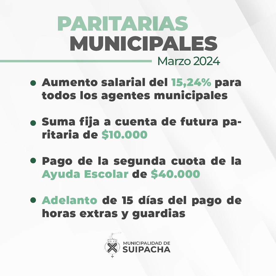 La Municipalidad de Suipacha otorgará a partir del mes de marzo un aumento salarial del 15% para todos los agentes municipales. Este aumento se da en el marco de las negociaciones paritarias que la comuna viene llevando adelante con los representantes de los trabajadores.
