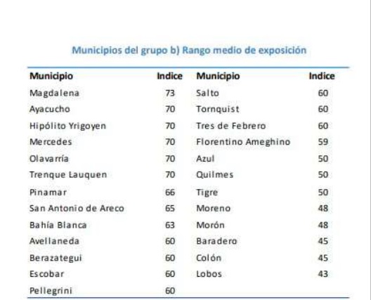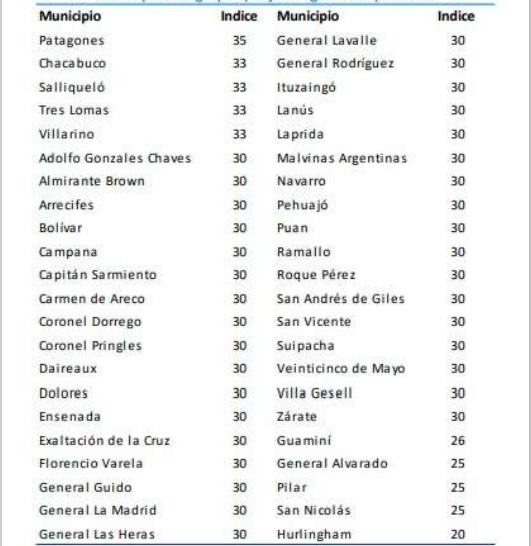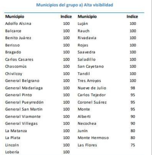Bajo ese marco, figuran municipios como Magdalena (73), Mercedes (70), Ayacucho (70), Olavarría (70), Trenque Lauquen (70), Pinamar (66), San Antonio de Areco (65), Bahía Blanca (63), Avellaneda (60), Berazategui (60), Florentino Ameghino (59), Azul (50) y Lobos (43).