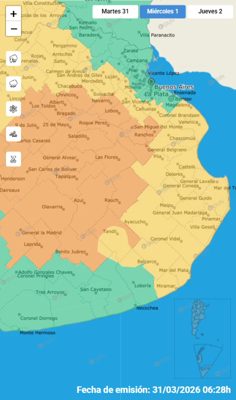 Sin embargo, el alivio llegará acompañado de un importante frente de inestabilidad. El Servicio Meteorológico Nacional (SMN) ha emitido alertas amarillos y naranjas para la provincia de Buenos Aires, debido al avance de un sistema frontal que ya provocó registros de hasta 100 mm en pocas horas en el sudoeste bonaerense.