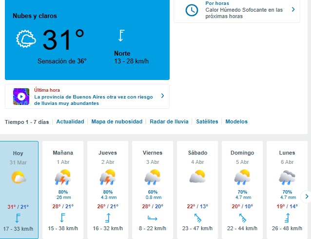 El último día de marzo marca una sensación térmica que rozó los 36°C en Mercedes. Se espera que el frente de tormentas avance desde el sudoeste bonaerense, afectando la zona central con abundantes precipitaciones entre el miércoles y el jueves. Para la región, se emitieron alertas amarillos y naranjas.