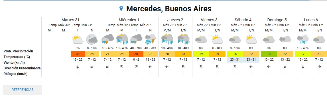 Miércoles 1: Se esperan lluvias y tormentas eléctricas desde las primeras horas de la mañana hasta la tarde-noche. Se estima una caída de agua cercana a los 26 mm. La temperatura máxima descenderá a los 28°C.