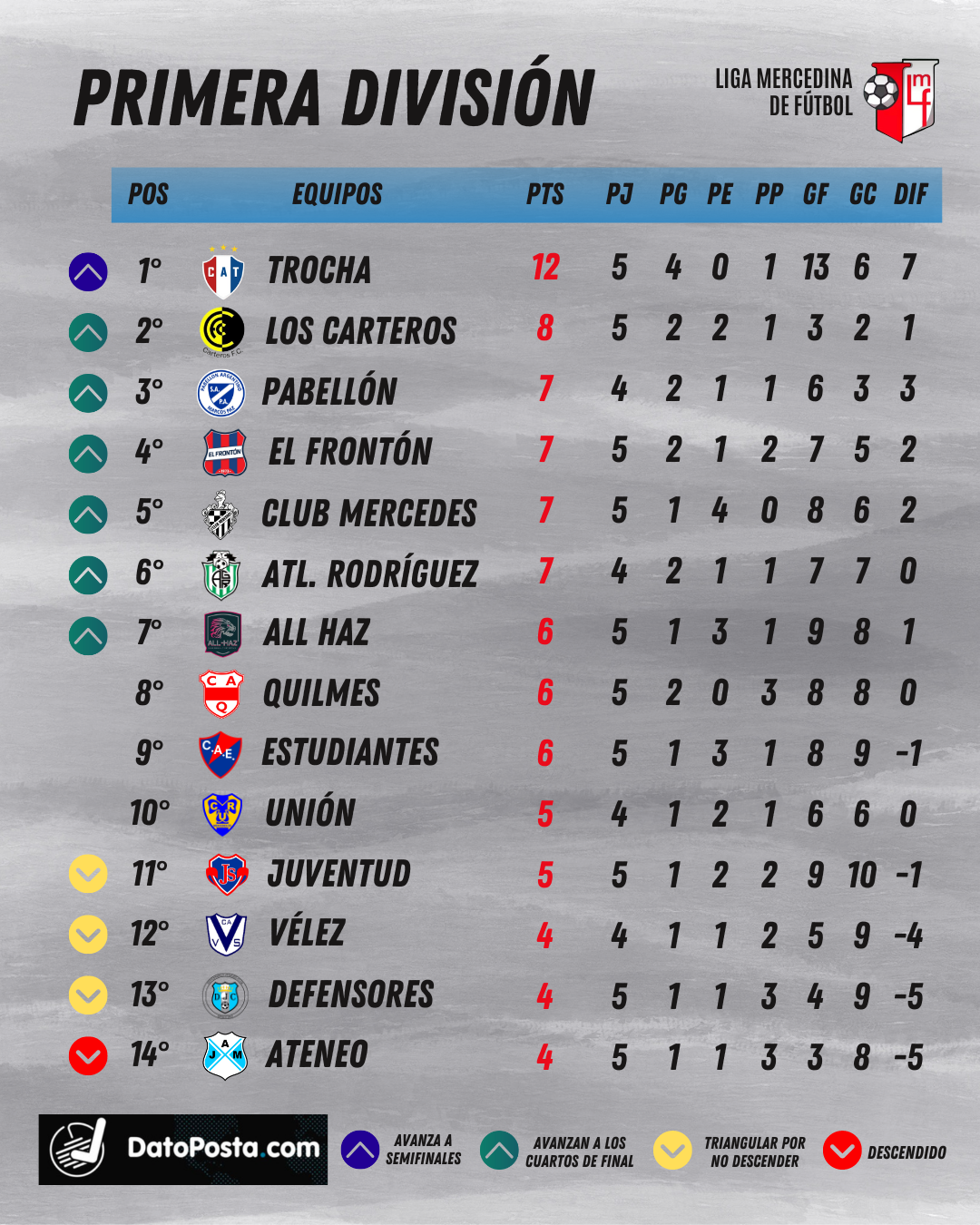 Este sábado, la Primera División de la Liga Mercedina de Fútbol disputó cinco de los siete partidos que componen la quinta fecha del Torneo Apertura. Trocha logró una gran victoria en duro partido sobre All Haz y sigue en lo más alto, mientras que Estudiantes, Ateneo y Defensores ganaron por primera vez.