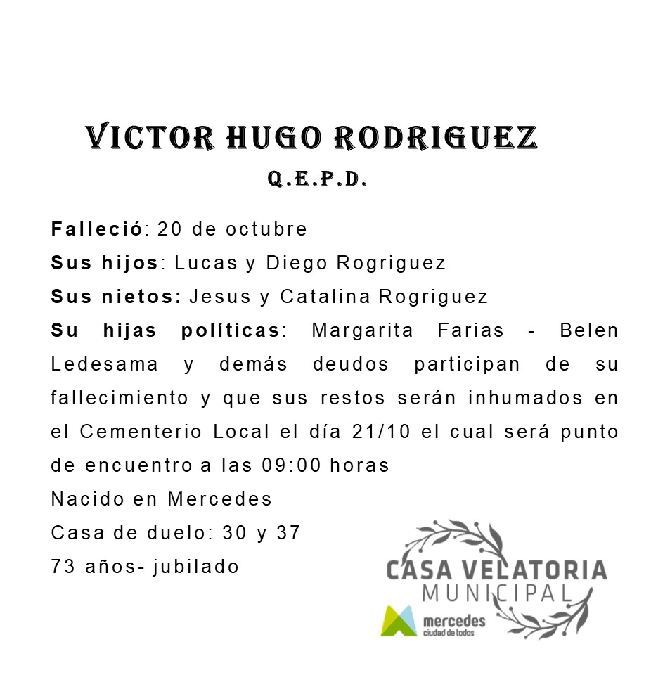 InicioSociedadObituarios Obituarios VICTOR HUGO RODRIGUEZ Q.E.P.D. By datoposta 20 octubre, 2025 0 732 FacebookTwitterPinterestWhatsApp Falleció el día 20 de octubre de 2025 Sepelio: Martes 21, a las 9 horas. Casa de duelo: 30 y 37🔎 Te puede interesarALCIDES DOMINGO PERASSI Q.E.P.D.febrero 2025ALICIA CELINA GIMENEZ VIUDA DE BENITEZ Q.E.P.D.marzo 2025LYDIA EDITH CIRIO VIUDA DE GONZALEZ Q.E.P.D.febrero 2025 73 años, jubilado Comparte esto: Haz clic para compartir en Facebook (Se abre en una ventana nueva) Facebook Haz clic para compartir en X (Se abre en una ventana nueva) X Me gusta esto:Me gusta Cargando... TagsVICTOR HUGO RODRIGUEZ Q.E.P.D. Cuota FacebookTwitterPinterestWhatsApp Artículo anteriorMERCEDES RUGBY QUEDÓ A LAS PUERTAS DE LOS PLAY OFF datoposta Articulos relacionados Obituarios LUIS NORBERTO LARREA Q.E.P.D. Sociedad GOWLAND Y AGOTE PRESENTES EN ENCUENTRO DE «JÓVENES Y MEMORIA» Sociedad MUCHAS FAMILIAS FESTEJARON EL DÍA DE LA NIÑEZ EN EL C.C. LA TROCHA Mas leidas Obituarios ABEL OMAR COLOMBO Q.E.P.D. Obituarios VICTOR HUGO RODRIGUEZ Q.E.P.D. Policiales RUTA 5: CAMIONETA EMBISTIÓ A UN VACUNO SUELTO DEJA UNA RESPUESTA Cancelar respuesta Comentario: Por favor ingrese su comentario! Nombre:* Por favor ingrese su nombre aquí Correo electrónico:* ¡Has introducido una dirección de correo electrónico incorrecta! Por favor ingrese su dirección de correo electrónico aquí Sitio web: Guardar mi nombre, correo electrónico y sitio web en este navegador la próxima vez que comente. Δ Seguinos4,568FansMe gusta985SeguidoresSeguir512SeguidoresSeguir Ultimos articulos Deportes MERCEDES RUGBY QUEDÓ A LAS PUERTAS DE LOS PLAY OFF Sociedad FUERTE INVERSIÓN EN EDUCACIÓN A TRAVÉS DEL PRESUPUESTO PARTICIPATIVO Policiales SEGURIDAD APLICA ORDENANZA SOBRE ANIMALES SUELTOS Nacionales TRUMP SOBRE LOS ARGENTINOS: «ESTÁN MURIENDO» Sociedad ONCE AÑOS DESPUÉS: VUELVE LA RONDA DE NEGOCIOS A MERCEDES Cargar más