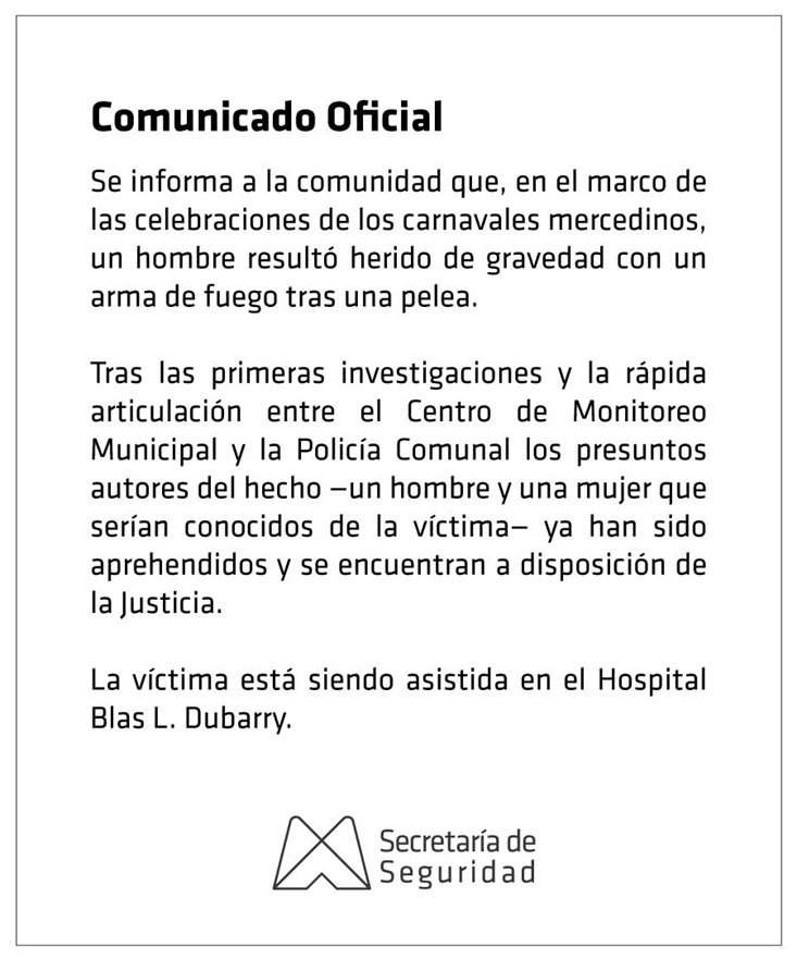 Lo que debía ser una fiesta popular se transformó en una escena de terror. Durante la segunda noche de los corsos mercedinos, un joven de aproximadamente 22 años fue gravemente herido de arma de fuego tras una disputa en las inmediaciones de la Avenida 29, entre 24 y 22. Hay dos personas aprehendidas.