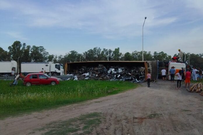 El hecho se produjo alrededor de las 17.30 horas, y rápidamente se llenó de vecinos en el lugar y complicó el normal desenvolvimiento del tránsito. Se trata de un Scania P94, que fue arrasyrado por el acoplado que iba cargado de chatarra.